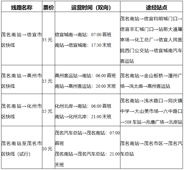 (三)动态调整。线路运营时间及站点可能优化,建议提前通过茂名交投集团微信公众号或现场咨询获取最新信息。